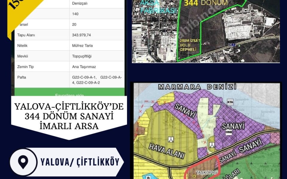 YALOVA ÇİFTLİKKÖY’DE 344 DÖNÜM SANAYİ İMARLI ARSA