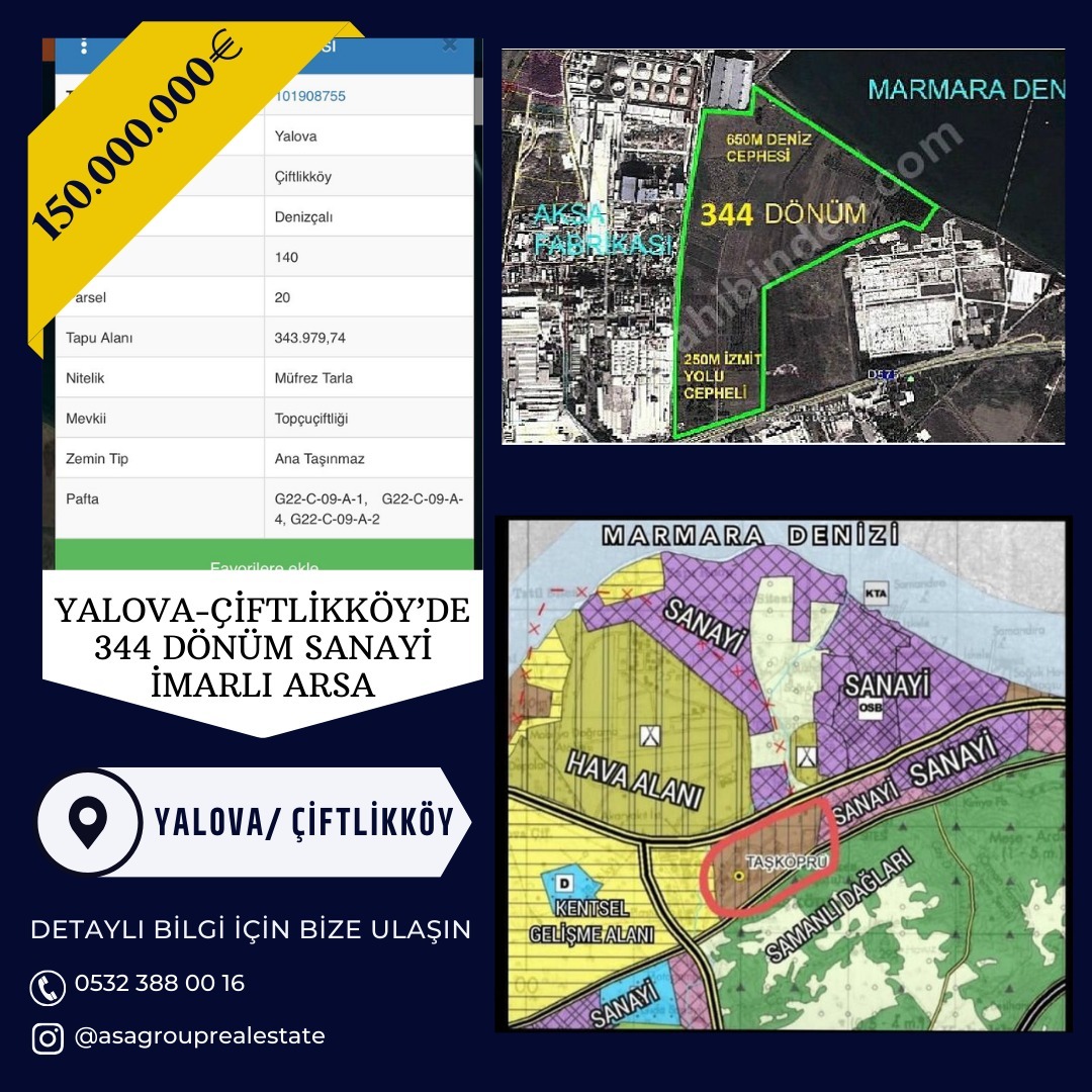 Yalova’nın hızla gelişen bölgesi Çiftlikköy Denizçalı mevkiinde, sanayi yatırımları için son derece uygun konumda yer alan büyük ölçekli arsamız satışa sunulmuştur.